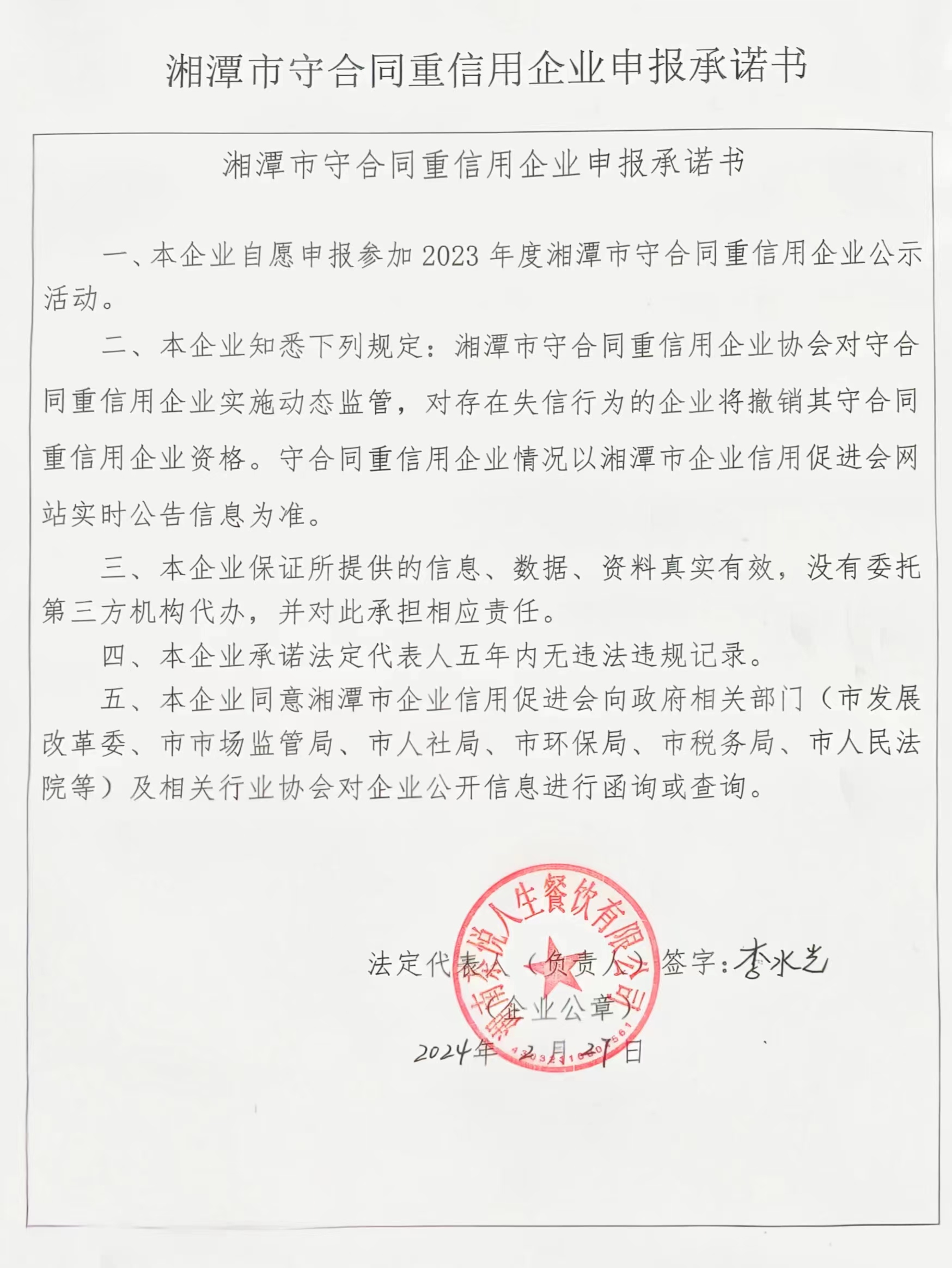 本企業(yè)根據(jù)《湘潭市守合同重信用企業(yè)申報(bào)規(guī)定》等編制 2023 年度企業(yè)信用報(bào)告書,并保證本報(bào)告書內(nèi)容真實(shí)、準(zhǔn)確、完整。