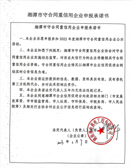 本企業(yè)根據(jù)《湘潭市守合同重信用企業(yè)申報(bào)規(guī)定》等編制 2022 年度企業(yè)信用報(bào)告書,并保證本報(bào)告書內(nèi)容真實(shí)、準(zhǔn)確、完整。
