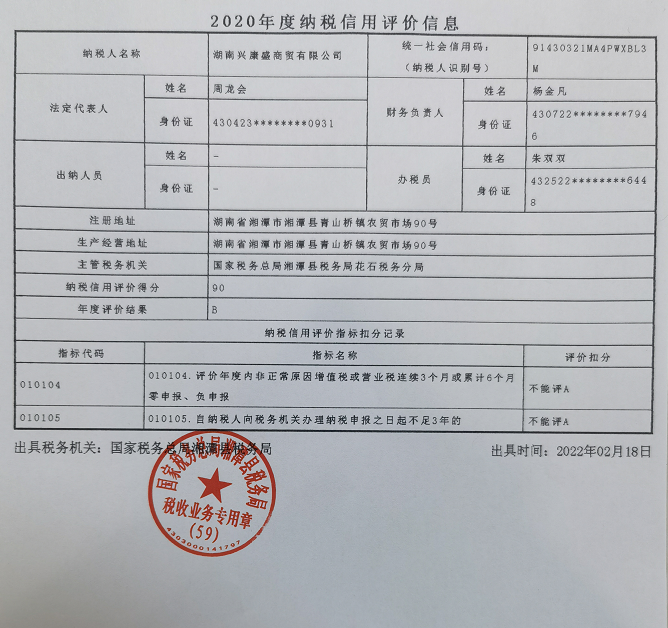 企業(yè)納稅信用等級報告: